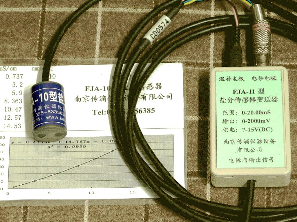 FJA-10型鹽分傳感器的主要部件是石墨電極和進(jìn)行溫度補(bǔ)償用的熱敏電阻。由四芯導(dǎo)線與電極插頭相連結(jié)。