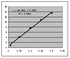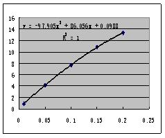 右圖用測(cè)定標(biāo)準(zhǔn)KCl標(biāo)準(zhǔn)曲線,X=(Y-b)/A.可以用線性回歸,但誤產(chǎn)在一些.如果用一元二次多項(xiàng)式回歸,雖有較高的精度,但求解麻煩,如果用EXCEL事先編好程序,求解就很方便了.只要輸入電導(dǎo)率(25℃),就自動(dòng)生成測(cè)定樣品濃度值mol/L.